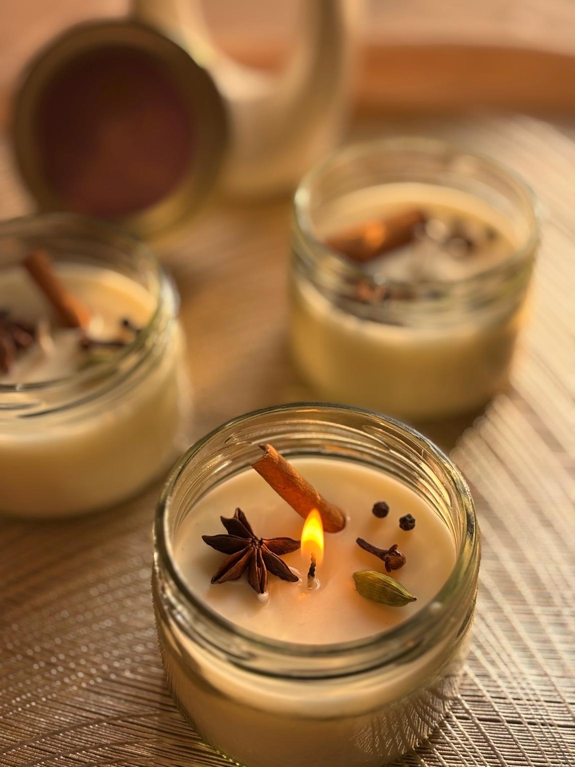 Light up your space 🕯️ with the warm aroma of clove, cinnamon, elaichi & black pepper 🌿 — a cozy blend of spice, soul, and serenity 💫” Cozy vibes in a jar — a cinnamon-scented hug lit by a gentle flame ✨🕯️